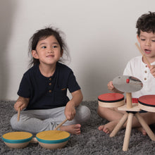 The Double Drum features 2 sizes of drums and a pair of drumsticks. Drumheads are made of natural rubber.